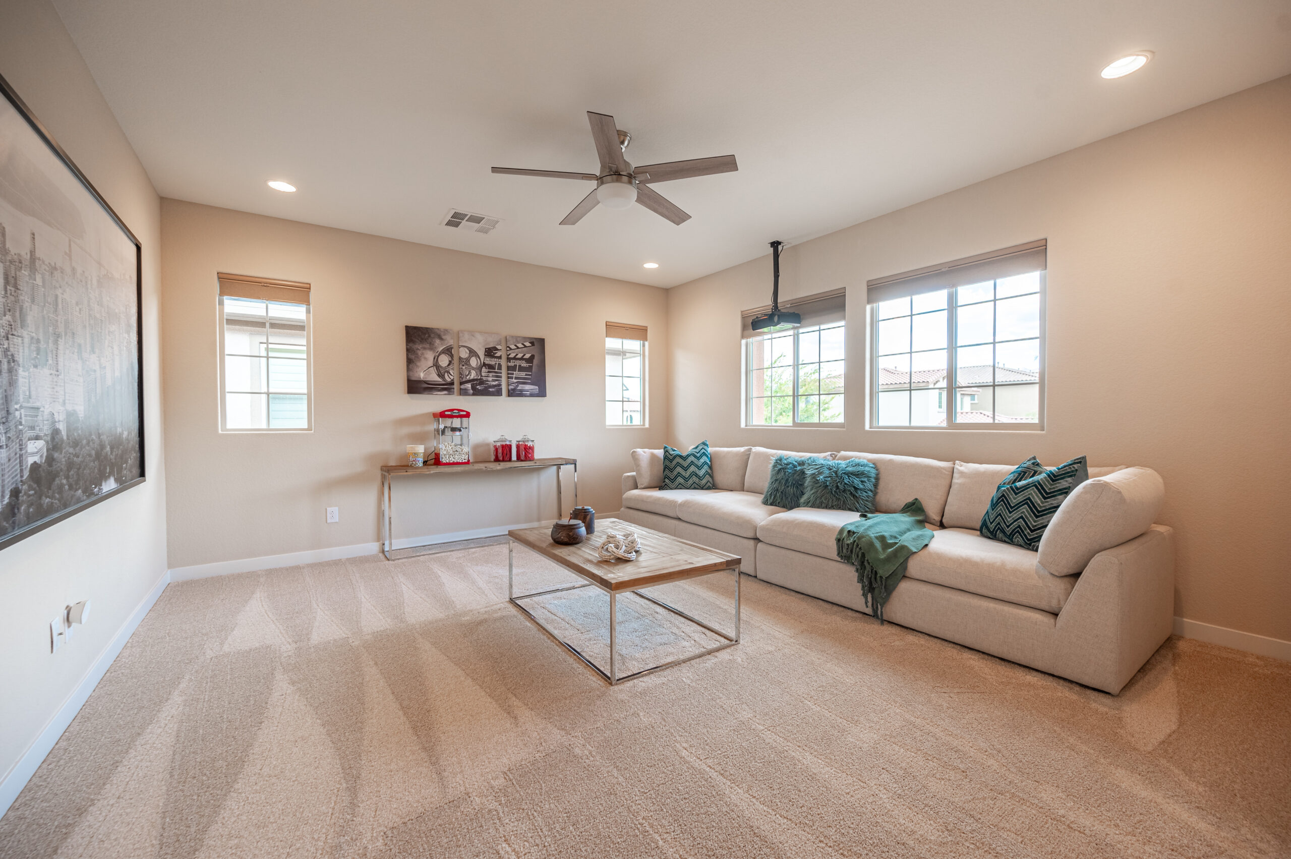The media room at Rose View is a cozy, inviting space, ideal for family movie nights or casual entertaining. We opted for a comfortable sectional sofa paired with a stylish coffee table, creating a layout that encourages relaxation. The choice of decor, including a striking black and white cityscape and a chic popcorn station, adds personality to the room without overwhelming it. This room is all about balance—comfort meets style in a space that feels warm and welcoming.