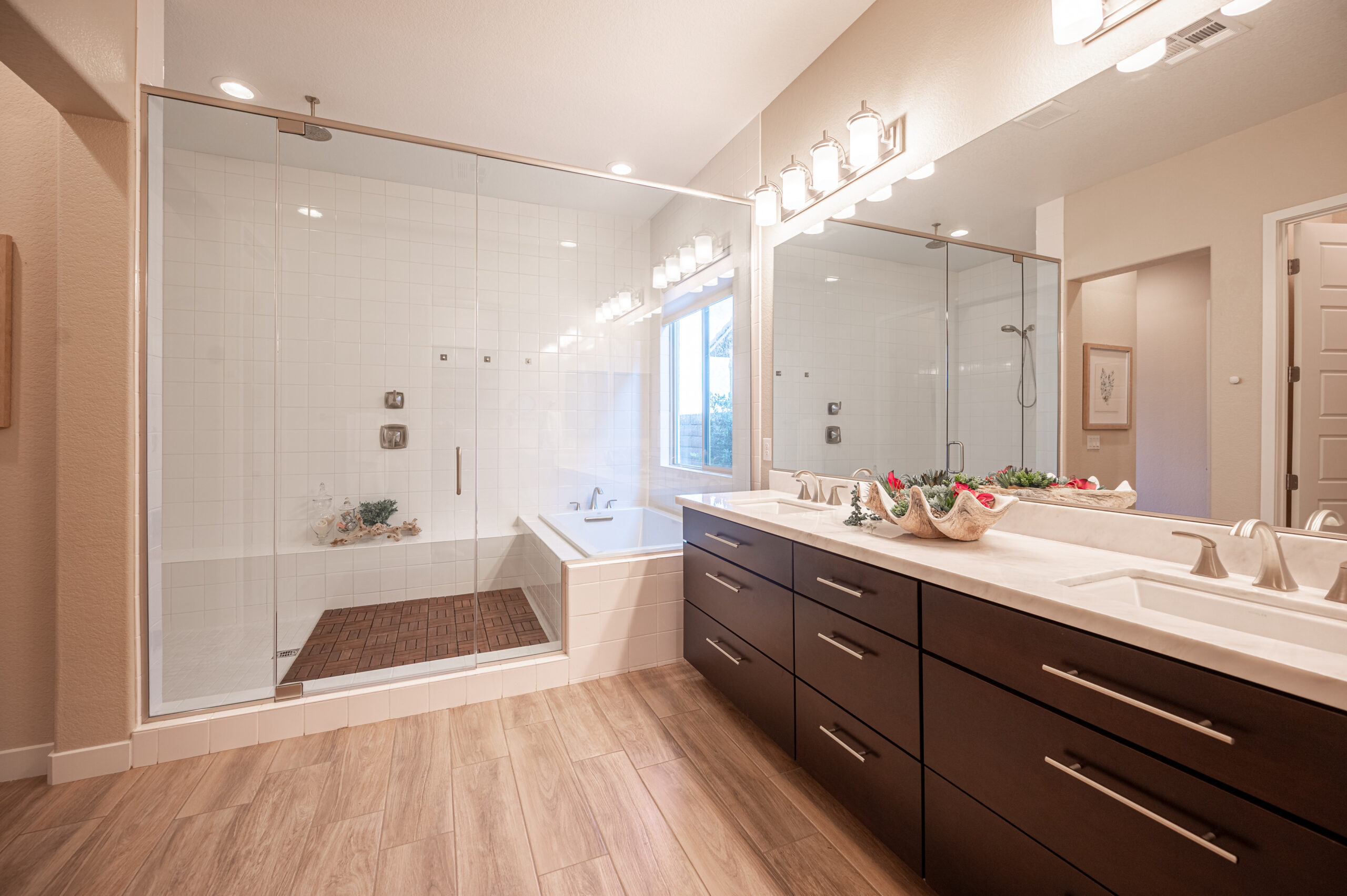 The master bathroom at Rose View is the epitome of luxury. With its expansive glass-enclosed shower, separate soaking tub, and sleek double vanity, this space was designed to offer a spa-like experience. Our staging focused on enhancing the natural beauty of the room, with minimal yet impactful decor that complements the modern fixtures. The use of light, neutral tones ensures that the bathroom feels bright and inviting, while the addition of subtle greenery adds a touch of nature, making it feel like a true retreat.